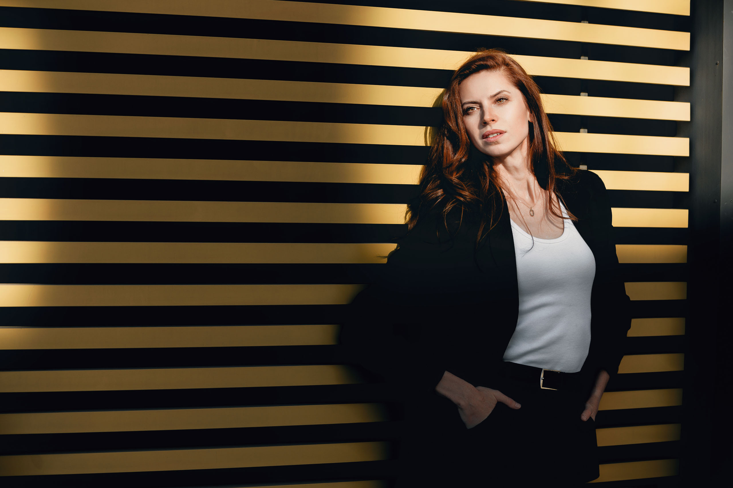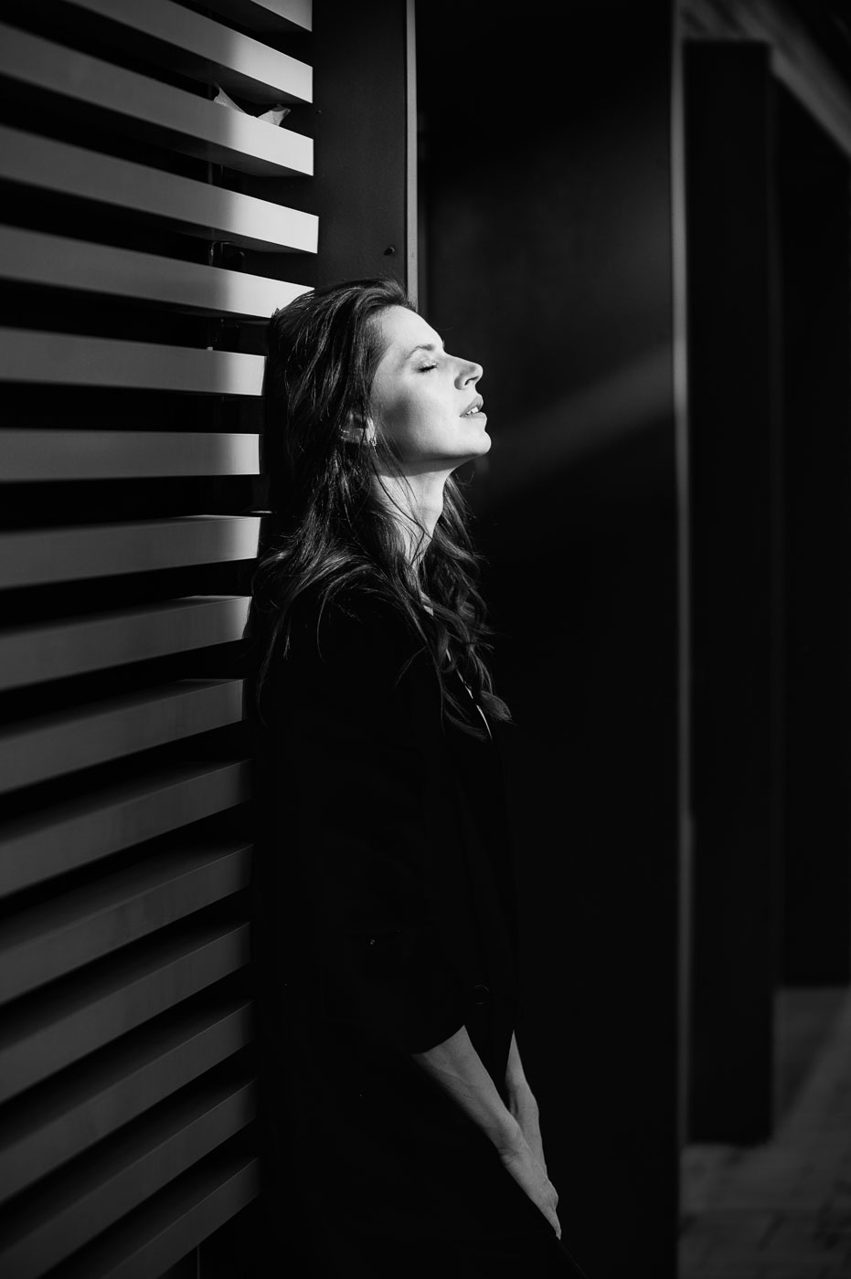 Но, как оказалось, вечернее солнце не только не помешало, а помогло образам этой фотосессии. Прямые и отражённые от больших окон торгового центра солнечные лучи создавали игру бликов и теней, своим жёстким светом и контрастом удачно дополняя строгий образ модели. А на некоторых кадрах освещение создало эффект прожектора, напоминая студийный свет.