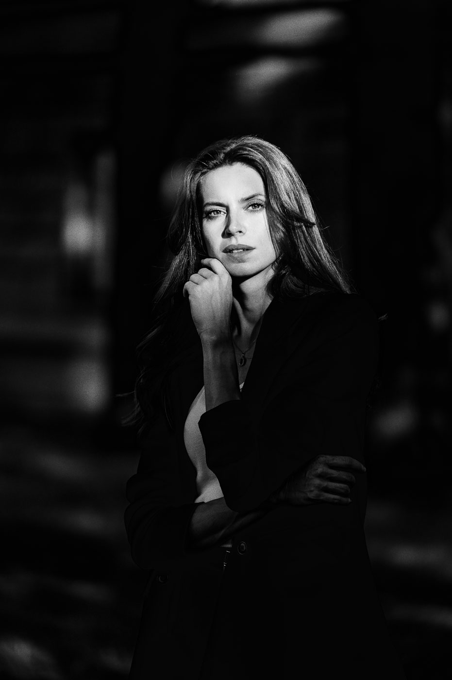 Затем я предложил продолжить съёмку в другом месте. И от торгового центра мы переместились в небольшой сквер неподалёку. Здесь прямой солнечный свет, на первый взгляд крайне неудачный, пятнами прорывавшийся сквозь листву и погружавший фон в темноту, опять-таки сработал на задуманный образ, позволив сделать интересное фото.